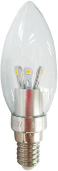 Bombilla LED tipo "vela" equivalente a una bombilla de incandescencia de 25W pero con un consumo de unicamente 3W. Regulable en intensidad. Haz de luz visible en 360º. Casquillo E14. Cristal transparente. Vida útil 40.000 horas. Garantía 2 años. Disponible en luz cálida (2700º).